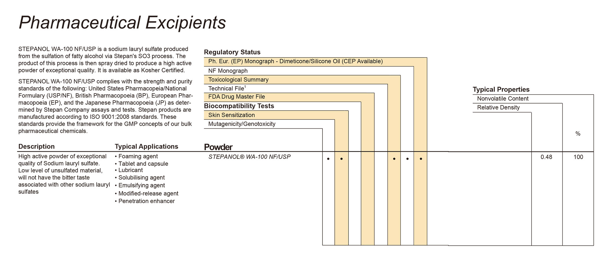 STEPANOL WA-100 NF/USP complies with the strength and purity standards of the following: United States Pharmacopeia/National Formulary (USP/NF), British Pharmacopoeia (BP), European Pharmacopoeia (EP), and the Japanese Pharmacopoeia (JP) as determined by Stepan Company assays and tests. Stepan products are manufactured according to ISO 9001:2008 standards. These standards provide the framework for the GMP concepts of our bulk pharmaceutical chemicals.